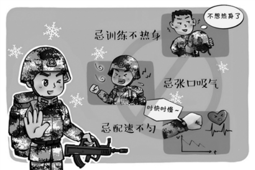 严寒天气下,人体肌肉黏滞性增大、体表毛细血管收缩、韧带弹性减弱、关节柔韧性降低,容易导致人体机能下降、关节僵硬、反应迟缓。如果在这种状态下直接进行武装越野训练,可能引发肌肉酸痛、关节扭伤、肌群拉伤等病症。