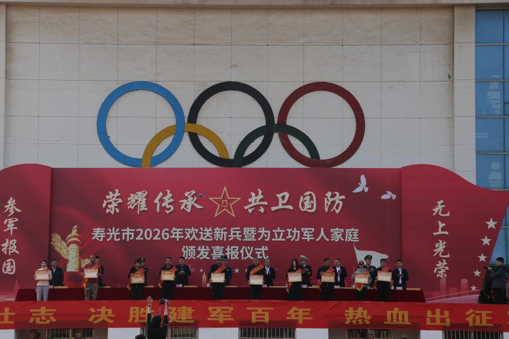3 月 17 日,寿光市 2026 年欢送新兵暨为立功军人家庭颁发喜报仪式在我校隆重举行。潍坊军分区司令员张晓龙,寿光市领导李鹏、庞然等,寿光市人武部政治委员张海涛出席活动。我院 2023 级定向培养军士生及寿光市义务兵身着戎装、肩披绶带,怀揣家乡父老期望,即将分批奔赴军营,开启保家卫国的光荣征程。